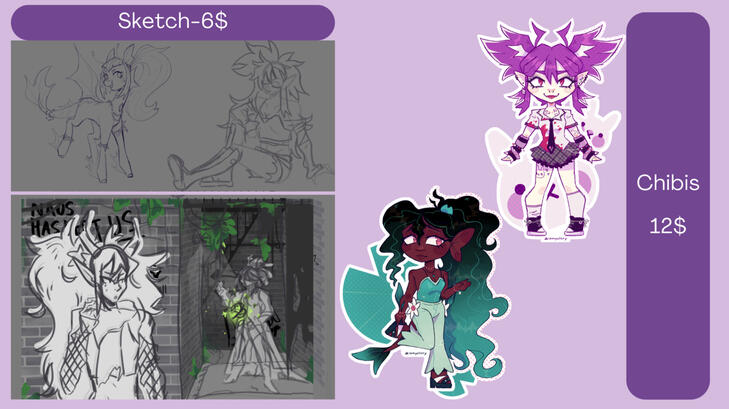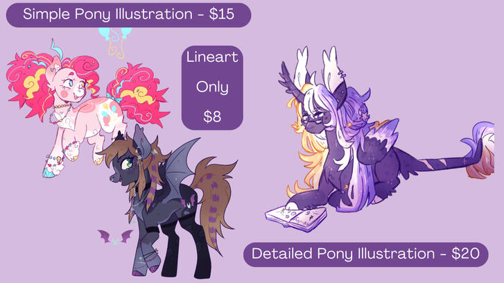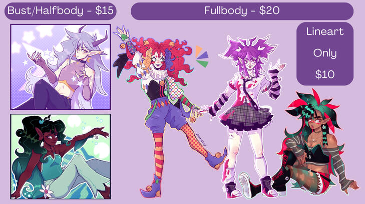 - I take 50/50 payment (50% of the cost immediately, and I will send you watermarked WIPS as we go, then I take the last 50% of the cost once I am done and I then send the final, unwatermarked image)- For additional characters (more than 1) in a commission, theyll be 50% of original cost unless you're ordering a full painting, in which case they are no additional cost.