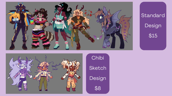 My art cannot be used for AI training or NFTS.- Ask for as many updates as you need! I’ll try and complete any commission/design as soon as possible, so unless I am swamped with work, It should take, at maximum, a week. I will let you know if I’m super busy/artblocked and will be slower than usual!- Do not refer to me as any of my real names, if you know them. Call me Zin. I get really uncomfortable with people using my real name.ADOPTABLE/CUSTOM RULES:- Resell them for no more than they were originally worth (unless they have more art than when you bought them).- Do not claim to be your own design (as in don't claim that you designed them yourself.)- Credit me somewhere for the design. Doesn't have to be every time, but like on their reference or in their Toyhouse.- Do not sell to anyone on the blacklist.