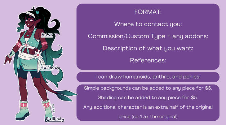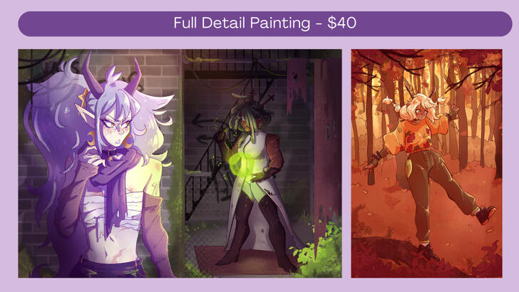 - I take 50/50 payment (50% of the cost immediately, and I will send you watermarked WIPS as we go, then I take the last 50% of the cost once I am done and I then send the final, unwatermarked image)- For additional characters (more than 1) in a commission, theyll be 50% of original cost unless you're ordering a full painting, in which case they are no additional cost.